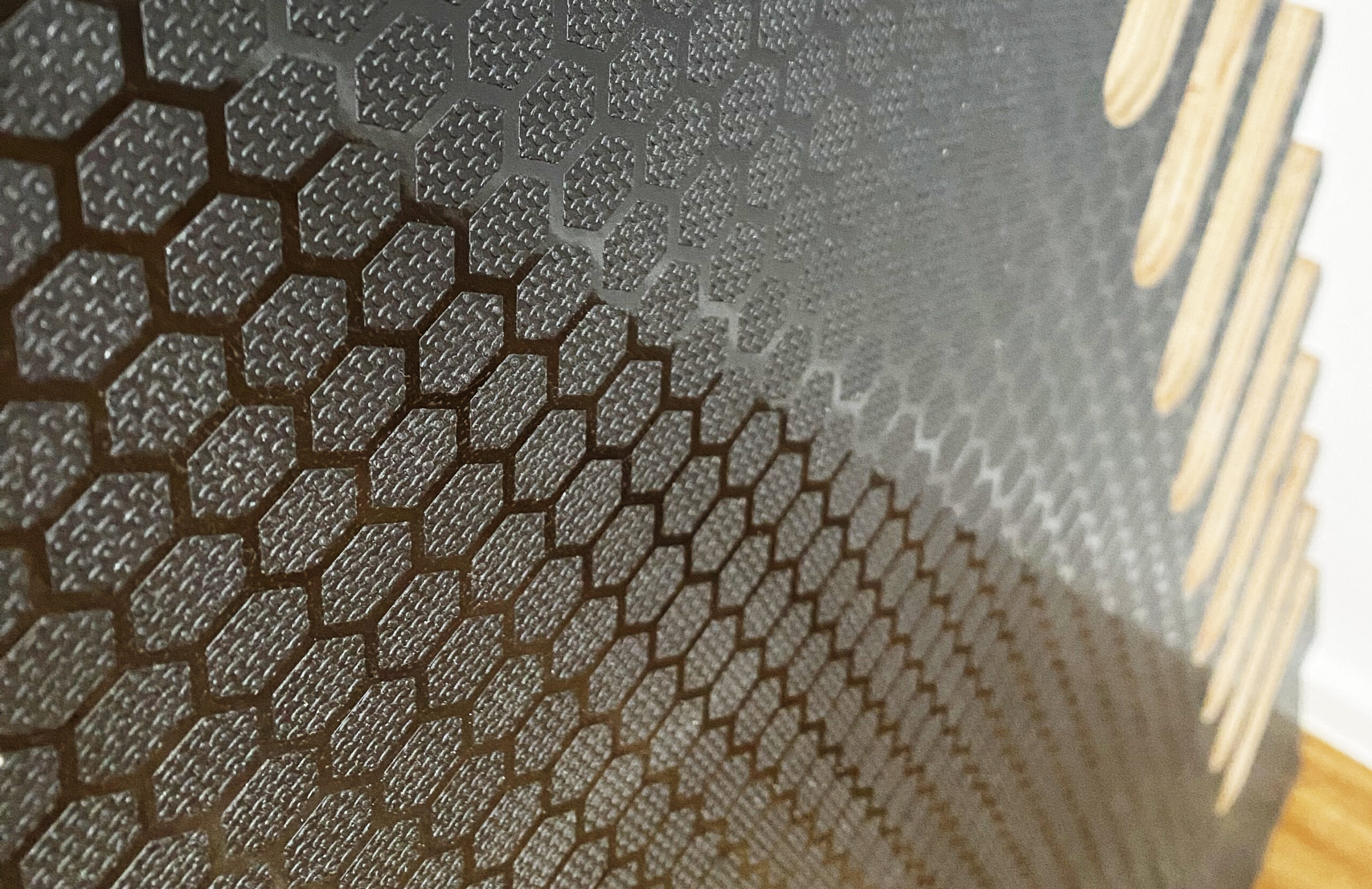 Made from premium Wisa-Hexa 13mm panels coated with phenolic resin laminate imprinted with a hexagonal pattern on exterior. Interior is coated with black phenolic film. WISA-Hexa is used as flooring panel in transport vehicles, industrial floors, work platforms, spectator stands and terraces, etc and makes a stunning feature with the hex finish. The hexagon pattern matches the electric skateboard themes and logos. This striking hexagon surface would look amazing as a feature in any home or studio.