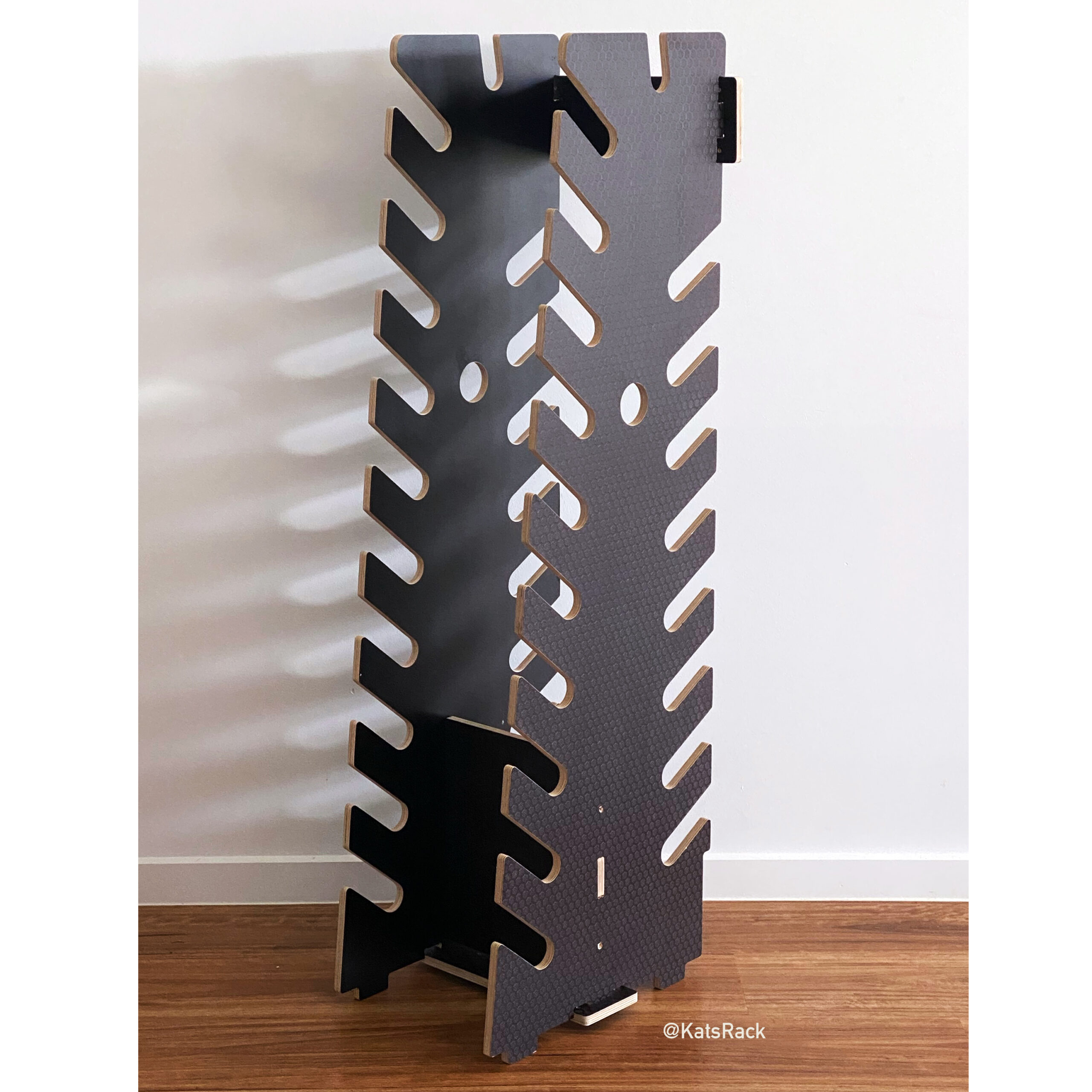 Freestanding at just under 1.2 metres tall this rack has extra wide 38mm slots & holds 6 complete boards with trucks and wheels at the front using very 2nd slot, and additional 4 complete boards at the rear.
