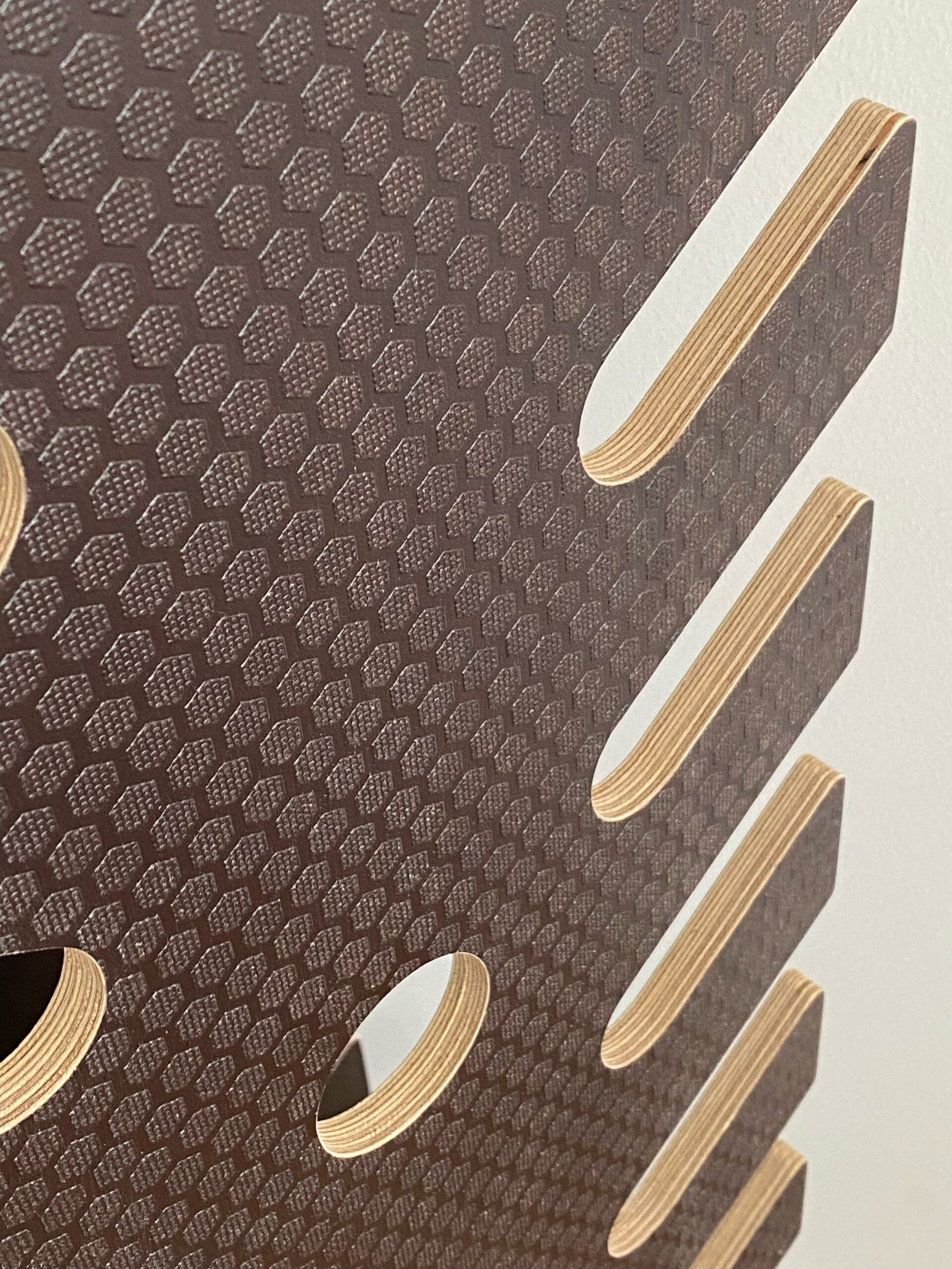 Made from premium Wisa-Hexa 13mm panels coated with phenolic resin laminate imprinted with a hexagonal pattern on exterior. Interior is coated with black phenolic film. WISA-Hexa is used as flooring panel in transport vehicles, industrial floors, work platforms, spectator stands and terraces, etc and makes a stunning feature with the hex finish. The hexagon pattern matches the electric skateboard themes and logos. This striking hexagon surface would look amazing as a feature in any home or studio.