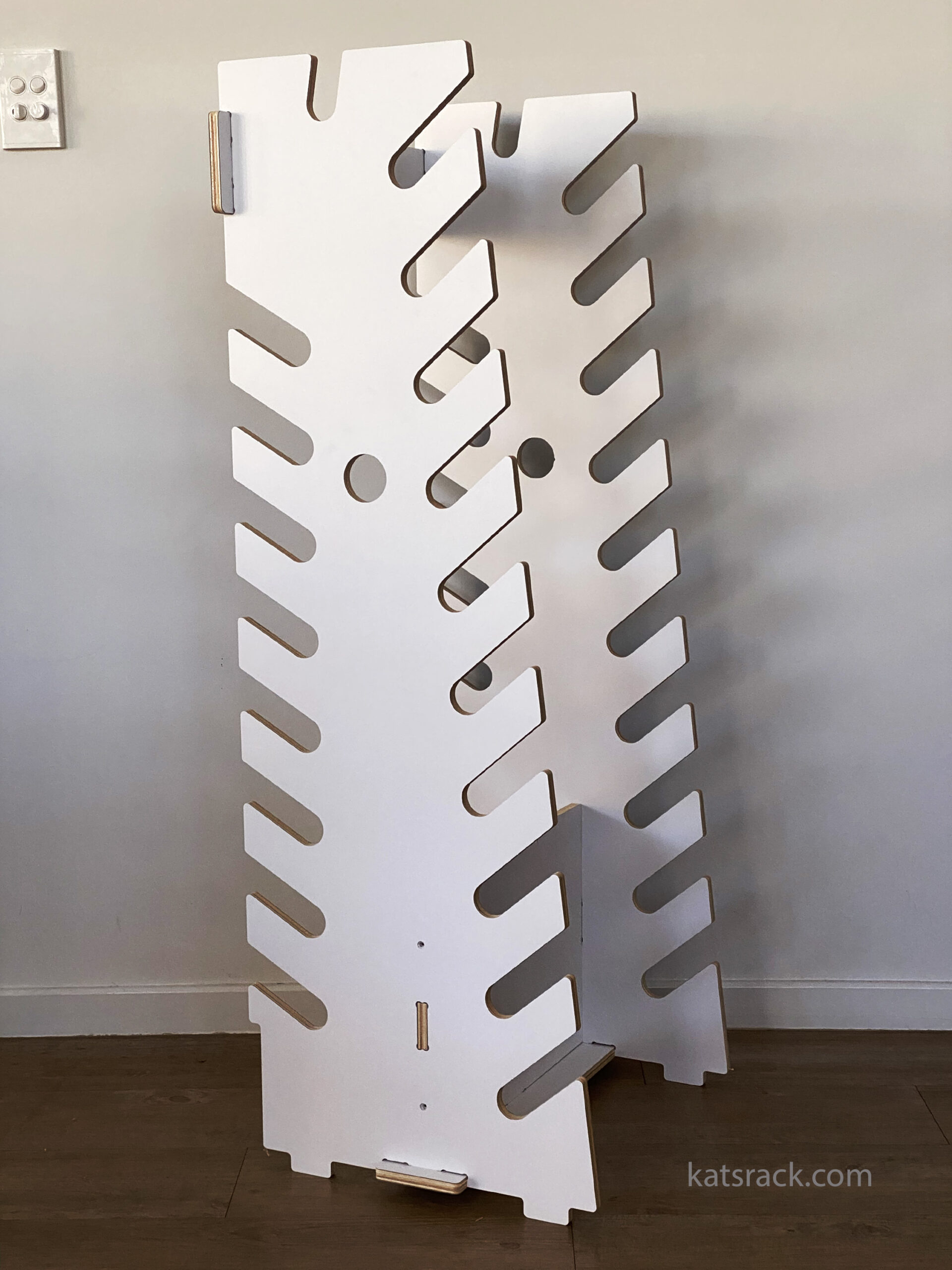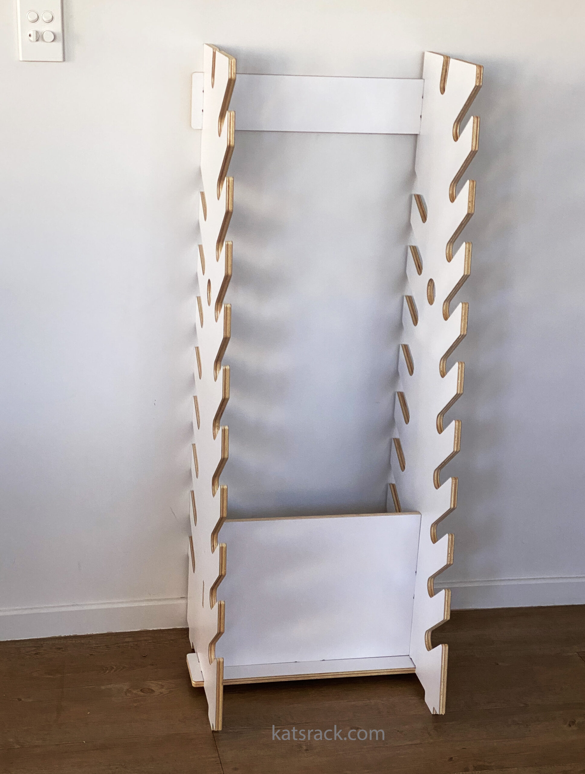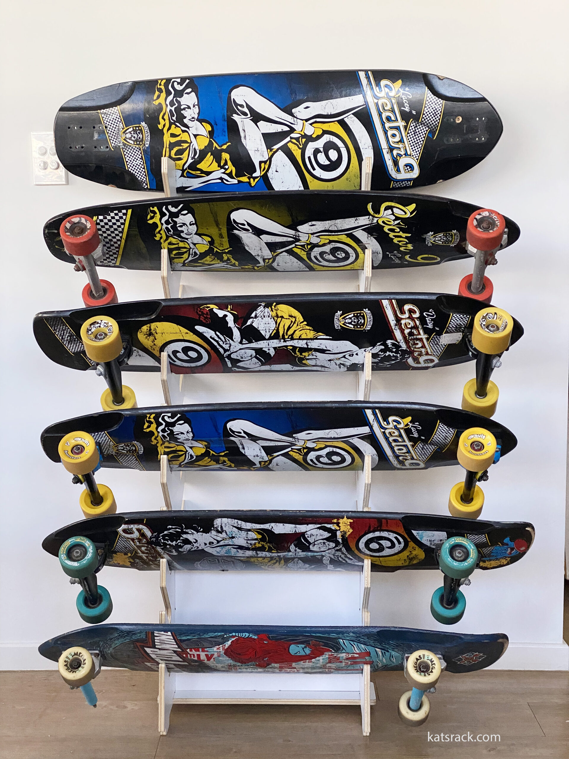 Freestanding at just under 1.2 metres tall this rack has extra wide 38mm slots & holds 6 complete boards with trucks and wheels at the front using very 2nd slot, and additional 4 complete boards at the rear.