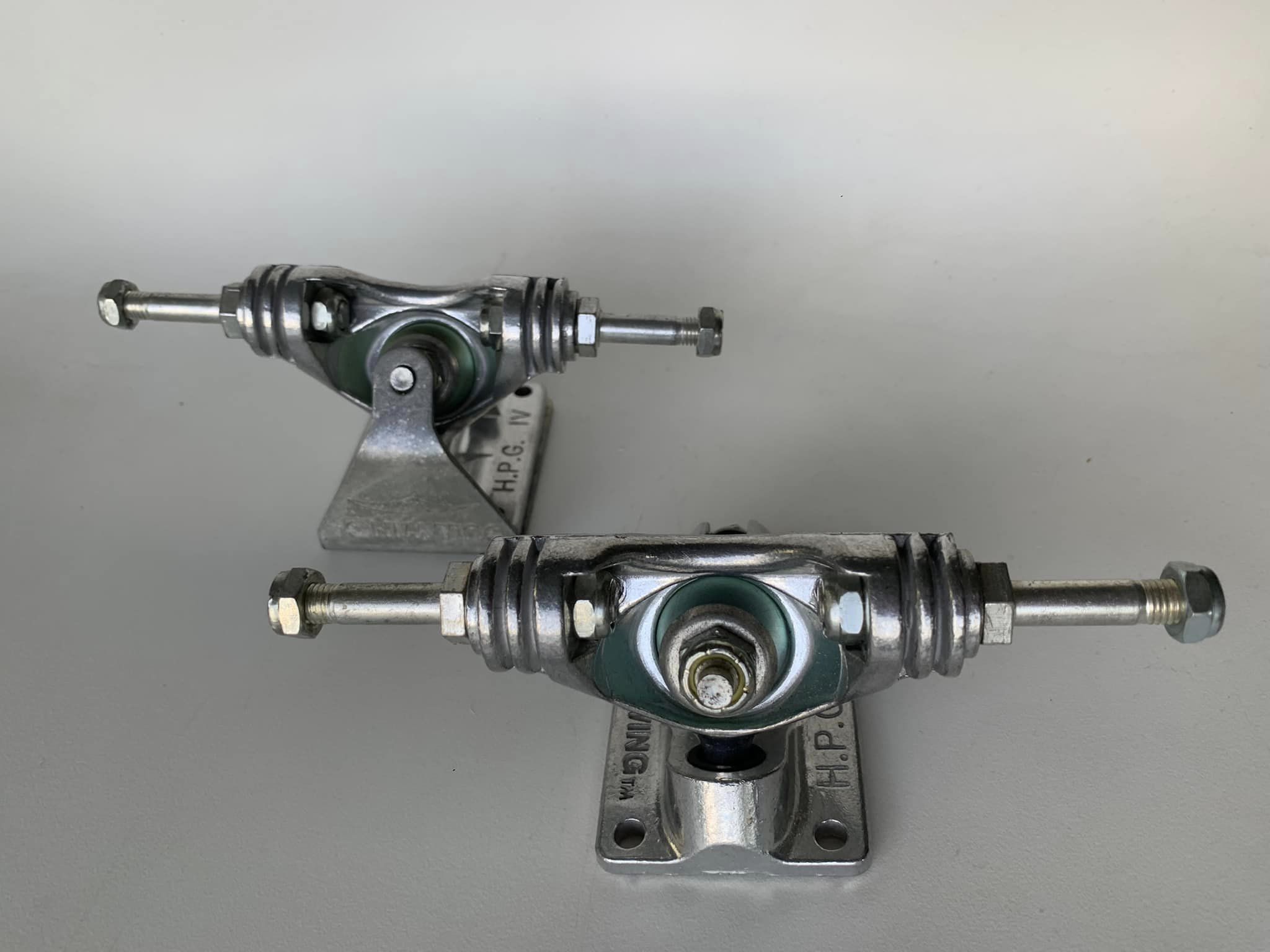 NOS Vintage 1970’s Gullwing H.P.G. IV Split Axle Trucks. These are new, from the original box, decades old and in never-used condition. Absolutely incredible rare find these days. There are imperfections on the paint & metal surface, this may be due to age or due to the manufacturing process 50+ years ago, however these have had very minimal human touch and arrived in our shop in the original packing from 50 years ago. They will be carefully repacked into a new box for safe shipping. The bushings appear in good shape although would certainly only be for display purpose.