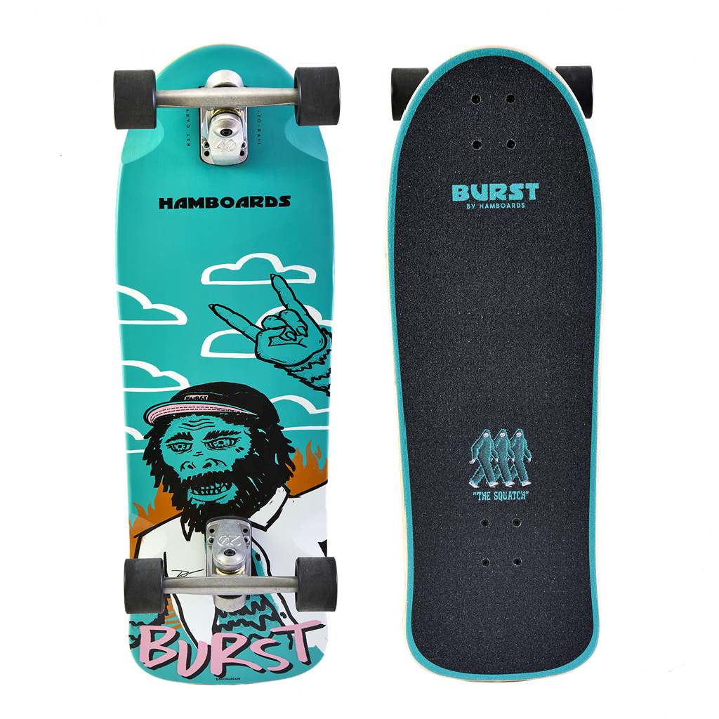 The Burst is built with the HST 2.0 truck system. It has a 40° pivot axis in the front, a 20° pivot axis in the rear, and both trucks have 180mm hangers. It is 32″ long and 10″ wide with a 19″ wheelbase. This setup makes the Burst pump like no other board we have ever made.