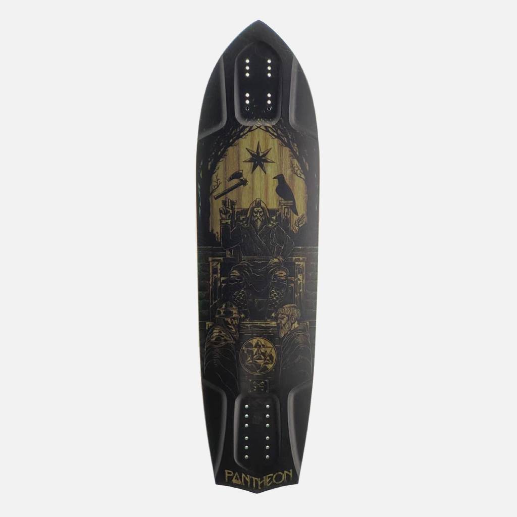 The Hierophant is built with the Pantheon“Summit Series” construction, featuring a lightweight poplar core and urethane sidewalls, as well as urethane in the truck hole mounting area, creating a completely waterproof package out of the box. The deck will not warp over time and will withstand weather of all types. Though no deck is perfectly durable, expect the Hierophant to be able to take a beating, and if you do manage to bust it open, usually fixes with this type of construction don’t go further than a little epoxy and a clamp.