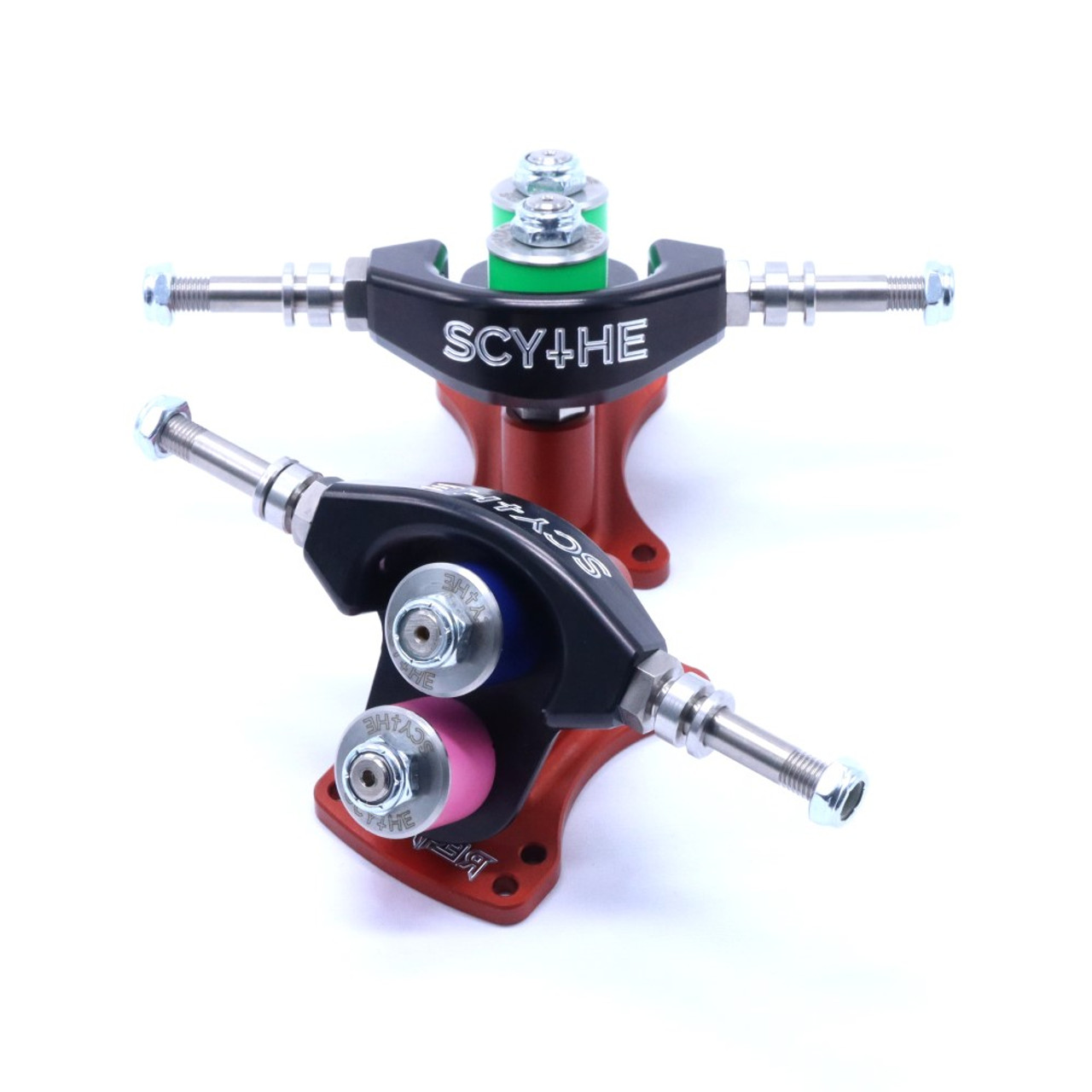 Featuring a maxed-out rake, minimized hanger width, and aggressive angle split – all in one set of trucks.
